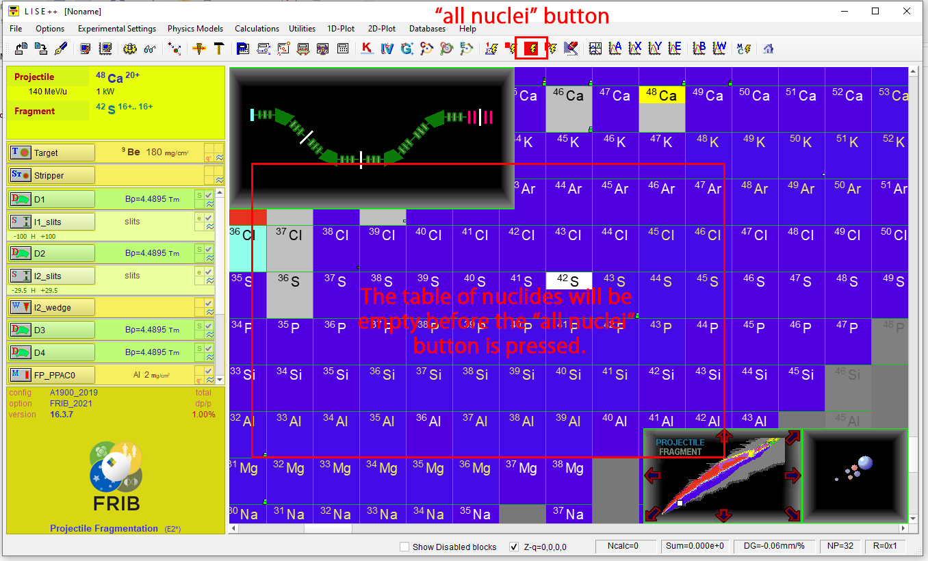that is twelfth from the right in the top tool bar once experimental parameters are selected. The table of nucleides will be empty before pressing the "all nuclei" button.