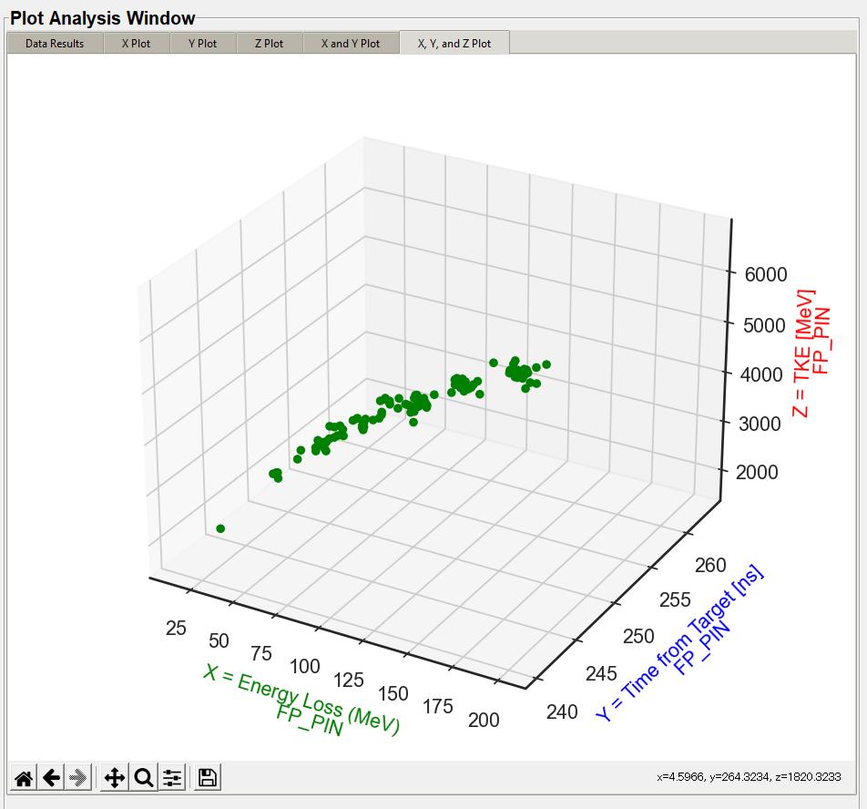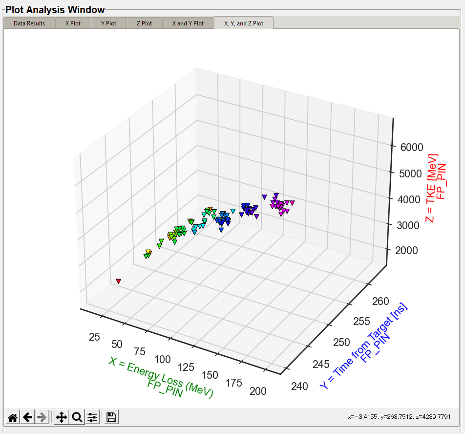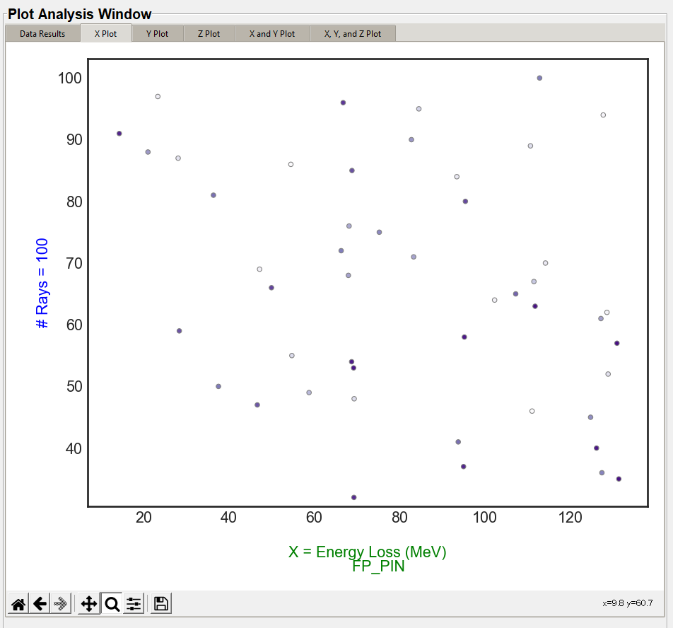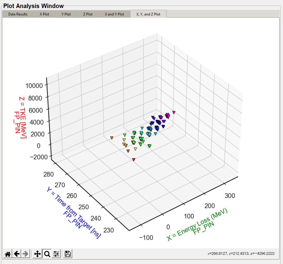 The X, Y, and Z plots function the same. The "X Value" column in the "Plot Settings" will display in the "X Plot" tab, the "Y Value" column will display on the "Y Plot" tab, and the "Z Value" column will display in the "Z Plot" tab. These are the same data columns shown in the "Data Results" tab. The below image is the default style the user will see with no style changes.
