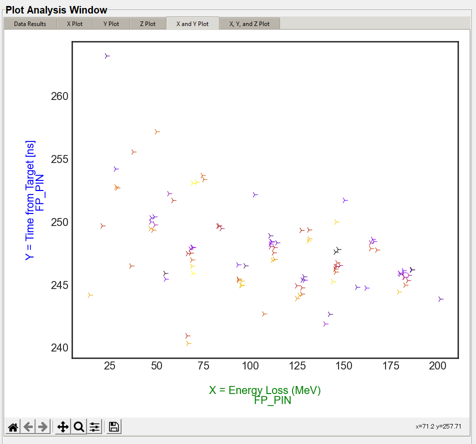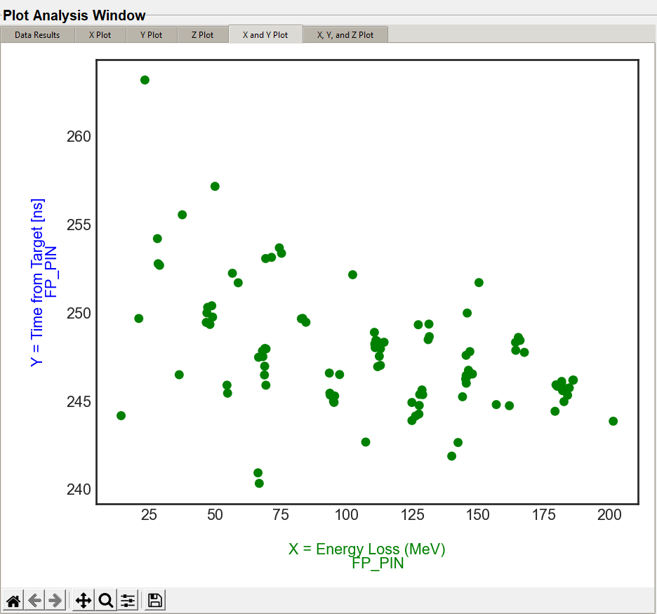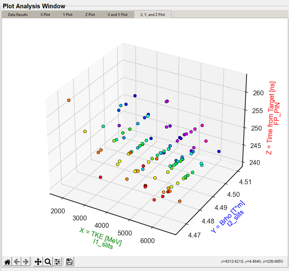 The "Location" combo box are the same as found in the Locations section. The "Locations" combo box is to allow the data set to be filtered to a specific range of data. This narrows the data results to a specific location within the fragment separator that is not necessarily the X, Y, or Z location chosen in the data sample you are plotting. For example in the graphic below , the X, Y, and Z locations are set to the location within the A1900 FP_PIN detector. The location selected in the "Data Range Filter" is selected to the location where the I1_Slits are within the A1900 fragment separator.