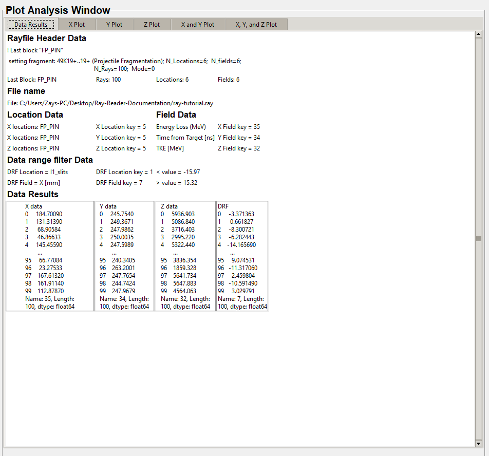The "Data Results" tab contains the data that was plotted from the .ray file.