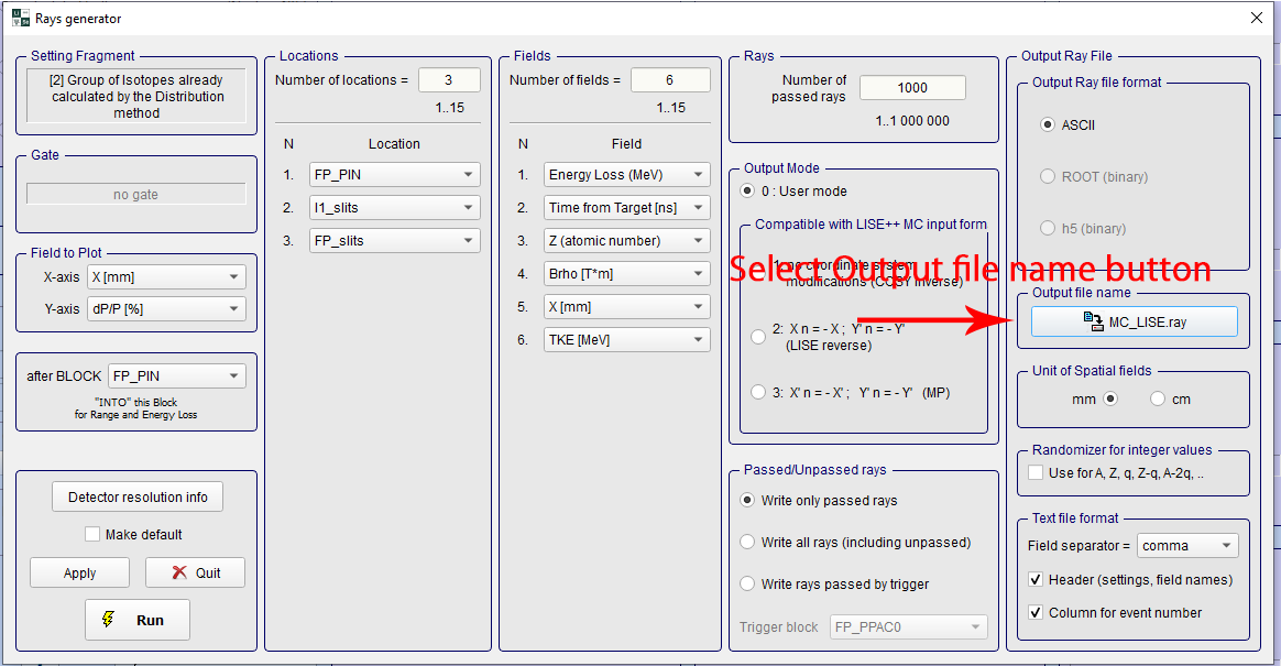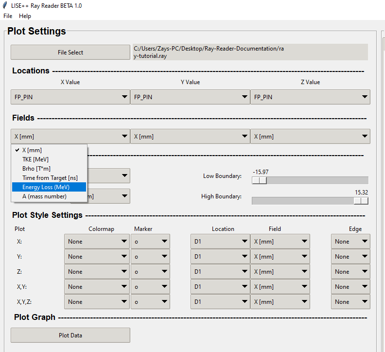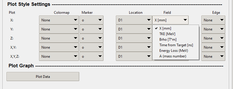 The field values will be the same in every field combo box throughout the program. The field values come from the .ray file that was generated within the Monte Carlo simulation in the LISE++ program.