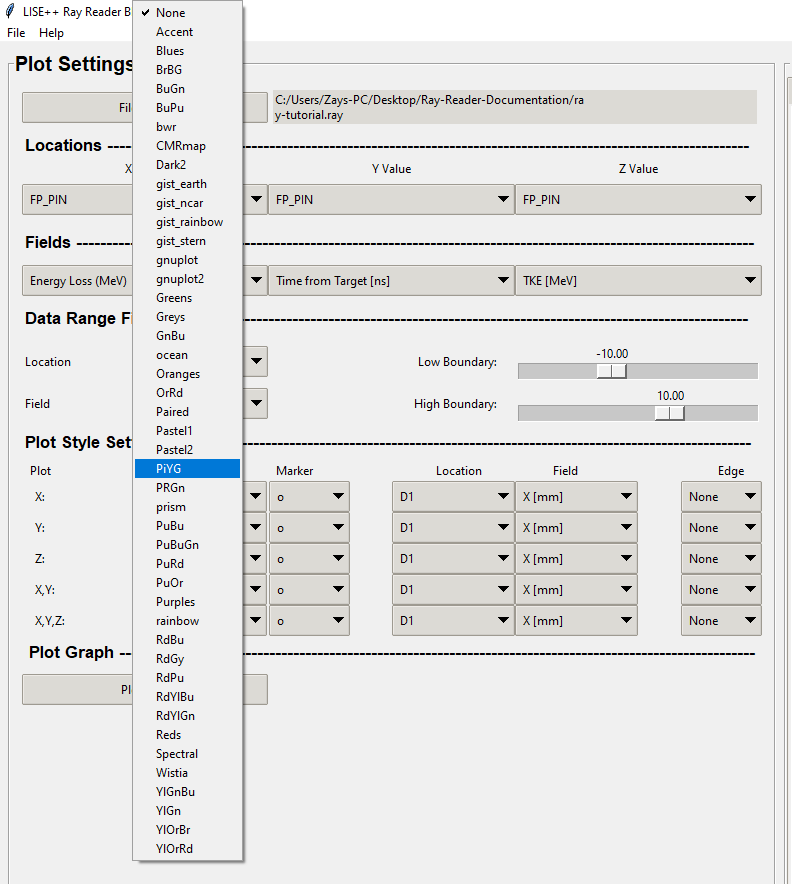 The color map combo box contains a various array of color styles that are supplied by the matplotlib documentation. The graphic below shows the available colormaps in the Ray Reader program combo box.