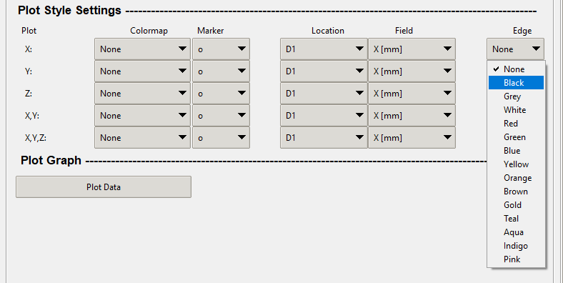 The "Location" combo box in the "Data Range Filter" allows the user to apply a colormap to your plots based on a different location that is specified in the X, Y, and Z Value columns. The graphic below shows where the "Location" combo box is in the "Data Range Filter."