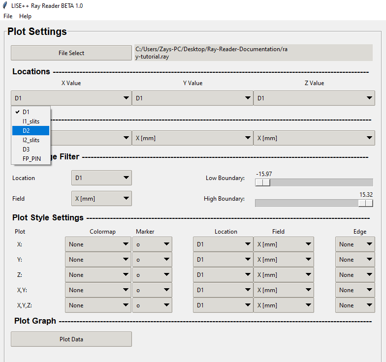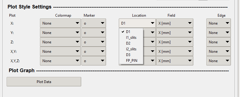 The user can select a location from the combo boxes in the "Locations" section. These locations are pulled from the .ray file that is generated from LISE++. The graphic below shows the X values in the combo box that was loaded from the ray file "ray-tutorial.ray."