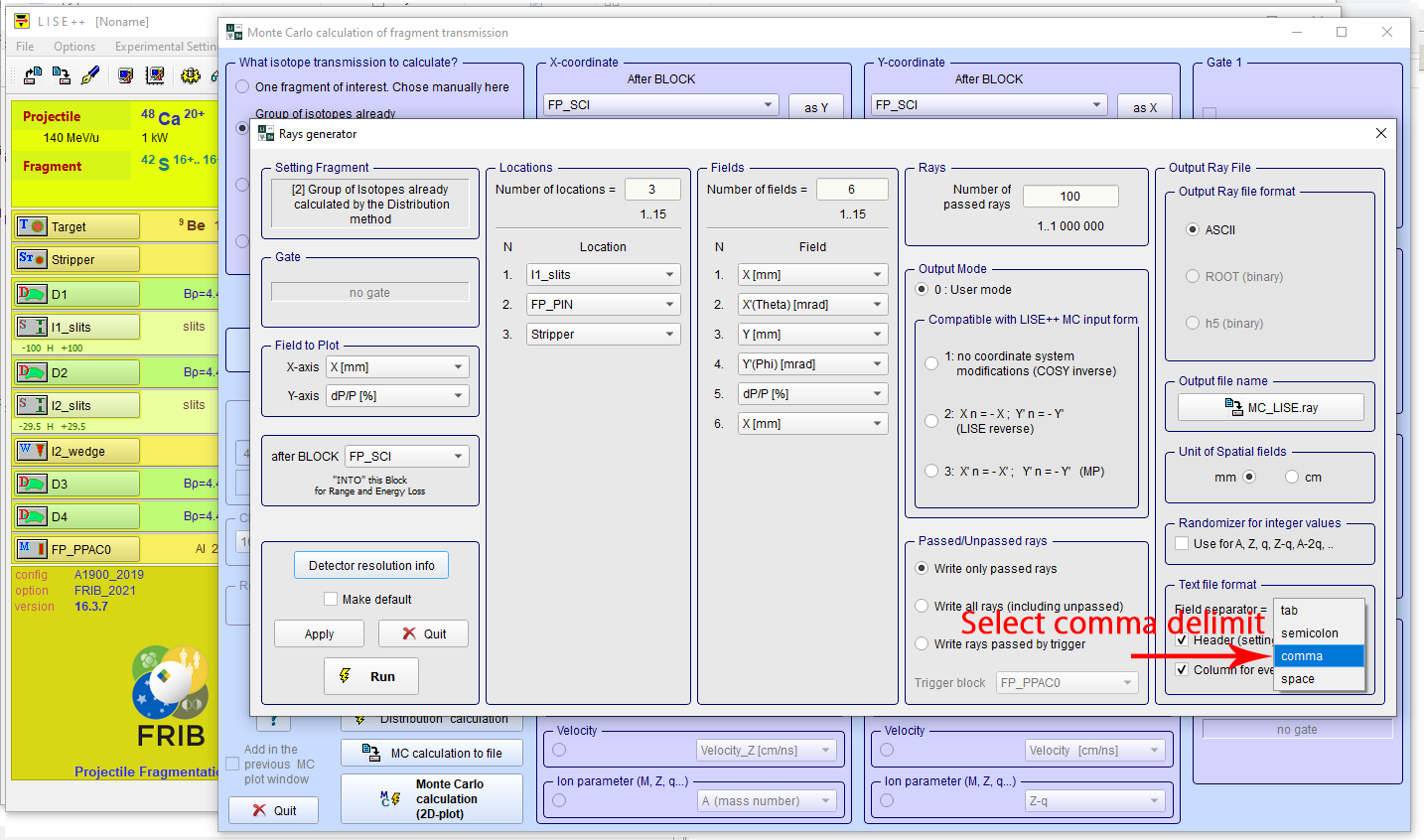 Step 11: Select locations to perform Monte Carlo simulation. In the locations combo box you can enter the number of locations you want. The example shown is for the A1900 fragment separator.