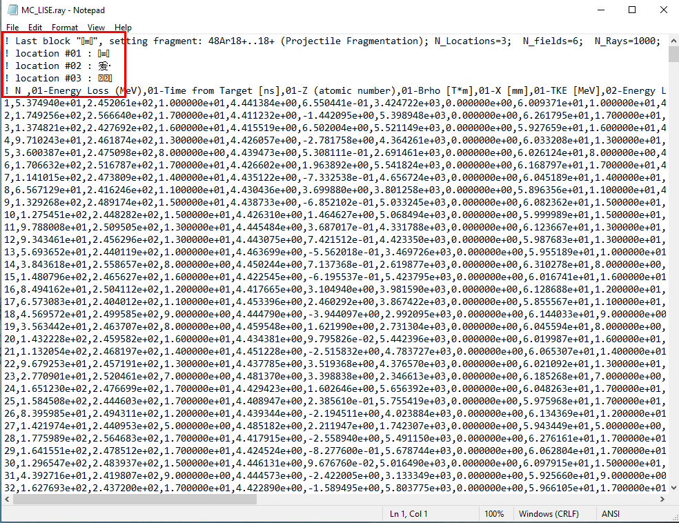 Contact the LISE++ developer and tell them the Monte Carlo Simulator is not creating a file with the correct character encoding. You can see the character encoding problem in the .ray file by opening the .ray file with notepad, excel or any other compatible program. You will see invalid characters in the file. The following graphic is an example of a file with invalid characters.